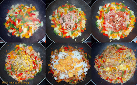 Esta receta, tuneada por mi, está basada en varias recetas de arroz frito de un libro de cocina que tengo que es todo de recetas de arroz. Se titula "Arroz. Más de 100 irresistibles recetas", de la editorial Parragón. Lo que he hecho ha sido coger los ingredientes de cada receta que más me llamaban la atención y seguir la forma de preparación común, para preparar esta receta de Arroz frito al estilo chino, a mi manera y con ingredientes muy fáciles de encontrar en cualquier supermercado.
