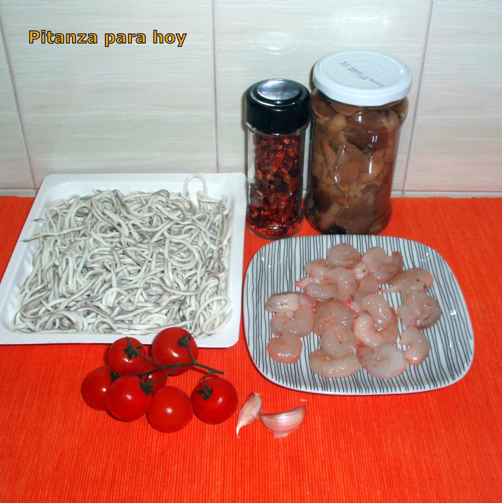 - Picar muy fino el ajo y sofreírlo en una sartén hasta dorarlo ligeramente. A continuación añadir las gambas y cocinarlas un par de minutos. Agregar las gulas y la pimienta Cayena removiéndolo todo y después agregar las setas escurridas. Cocinar durante 2 minutos removiendo continuamente. Salpimentar y reservar.