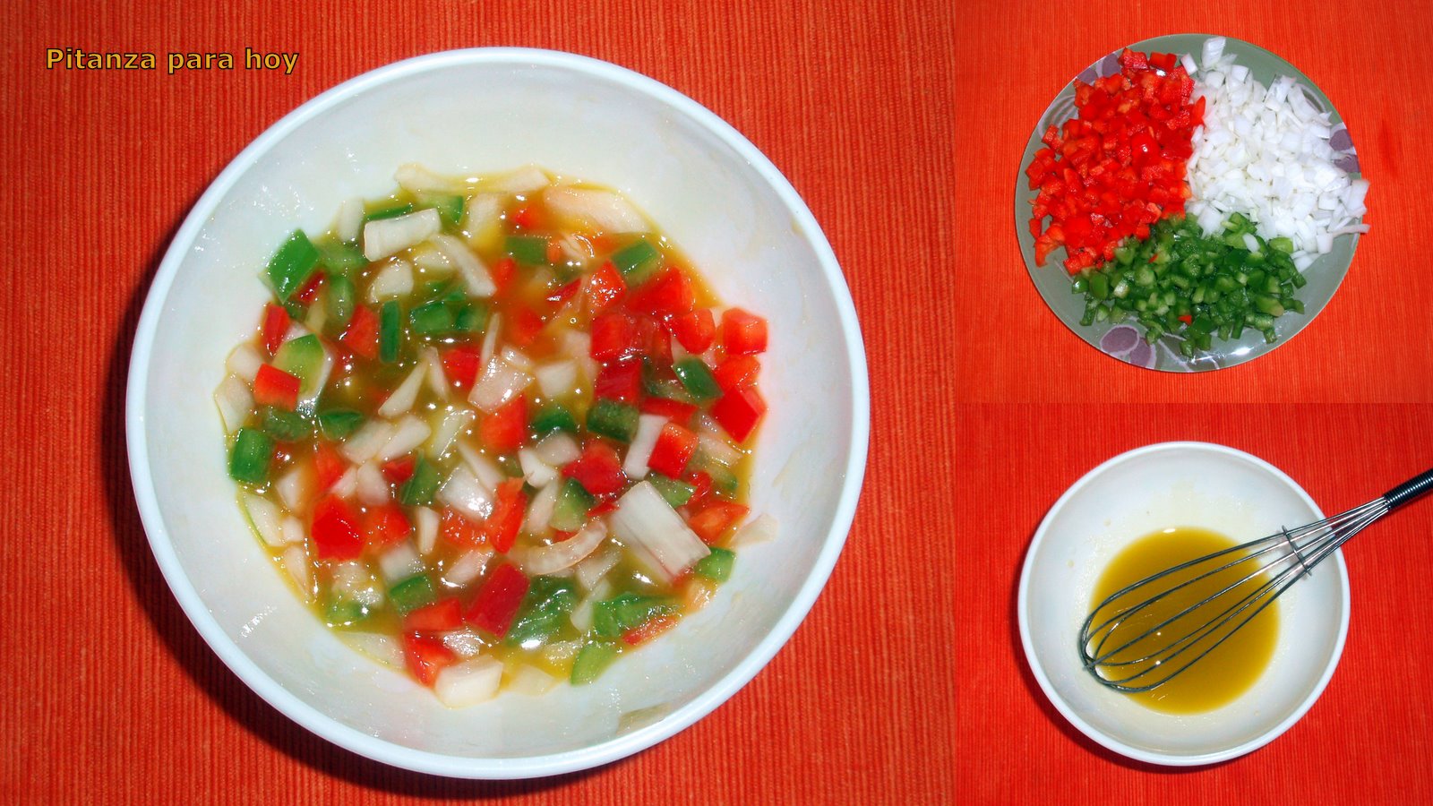 - Para preparar la vinagreta cortar en brunoise (pequeños dados) los pimientos rojo y verde y la cebolleta. En un cuenco verter dos cucharadas de aceite por cada cucharada de vinagre y una pizca de sal. Mezclarlo con un batidor para emulsionar los ingredientes, añadiendo después las verduras troceadas y volver a mezclarlo todo. Dejar que macere mientras se prepara la ensalada.