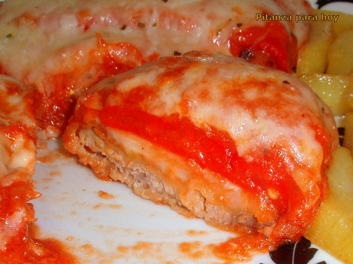- Servimos los escalopines a la napolitana acompañados de patatas fritas.