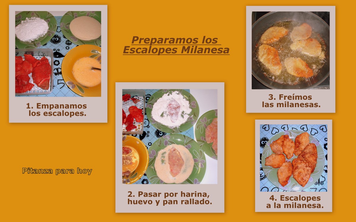 - Para lograr un perfecto empanado de los filetes o escalopes, tras haberlos salado, lo mejor es pasarlos, en este orden, por: harina, huevo batido y pan rallado.