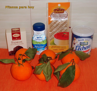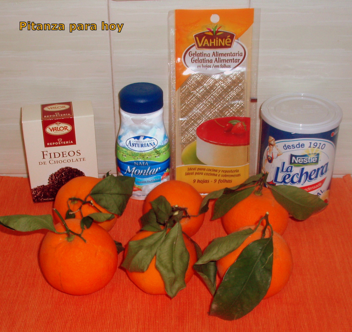 Además, no acaba ahí mi aventura con la mousse de naranja. En la primera que hice, que era esta misma receta que publico ahora, utilicé gelatina neutra en polvo ¡error! Según las instrucciones del paquete veo que no era lo más adecuado para una mousse y en vez de disolverse en la crema, los granitos de polvo cobraron vida y se convirtieron en pequeñas bolitas de gelatina que no eran nada agradables para el paladar... a pesar de que el sabor de la mousse sí era bueno. Total, que la tercera vez que la preparé utilicé la gelatina que viene en forma de placas y que hay que hidratarla. Pero cómo se usa ya os lo cuento a continuación. Y no me enrollo más, vamos con la receta de la mousse de naranja.