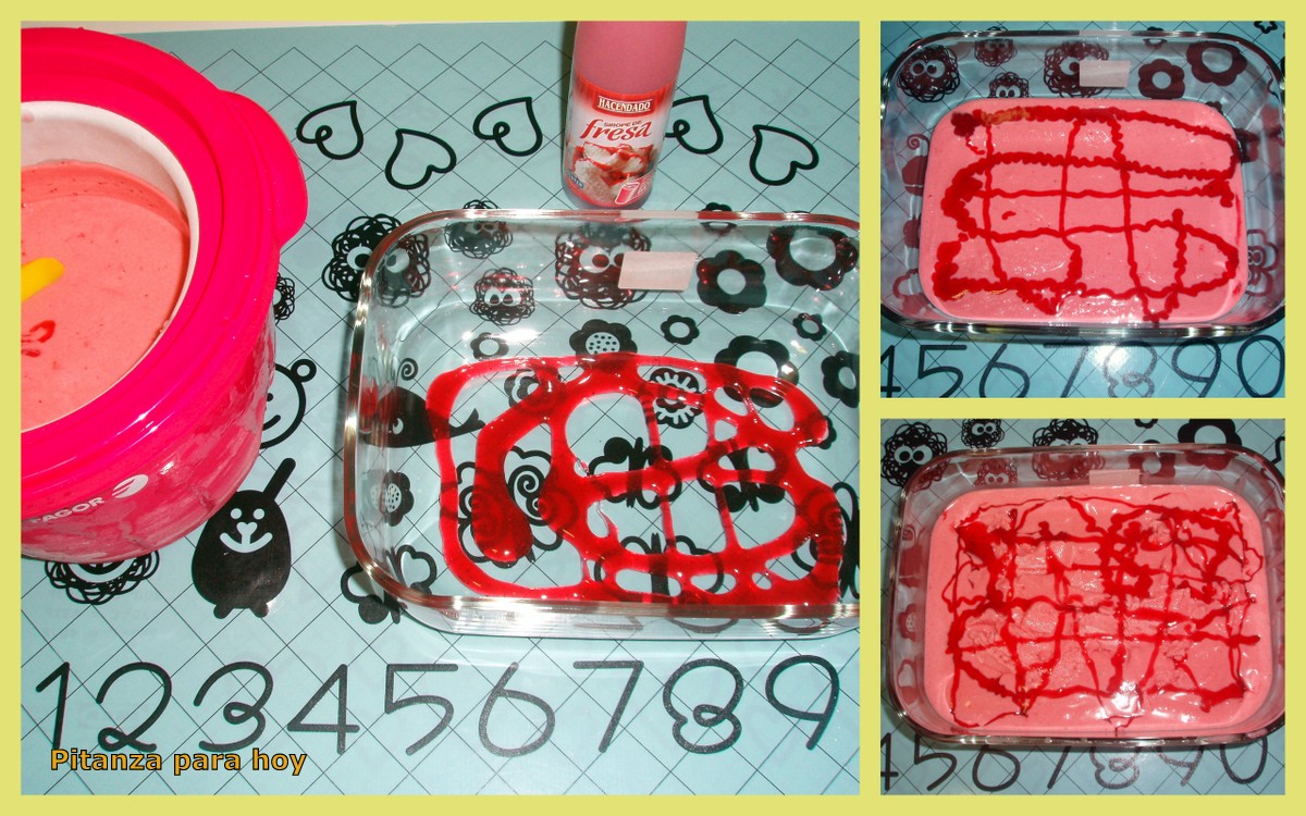 9. Si deseamos que nuestro helado casero de fresa tenga vetas de sirope en su interior verteremos un hilillo de sirope de fresa en el fondo del recipiente donde lo vamos a congelar; después vertemos una capa de la crema del helado y cubrimos con más sirope; repetimos la operación hasta tener toda la crema del helado en el recipiente.