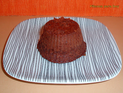 7. Cocemos en el microondas durante 1 minuto a 800 W de potencia. (Consejo: probad mejor cociendo un molde sólo para poder controlar el tiempo que necesita vuestro microondas antes de cocer los demás volcanes de chocolate).