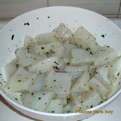- Colocar los trozos de sepia en un cuenco y adobarlos con el ajo picado muy fino, el perejil, sal y 2 cucharadas de aceite. Mezclar para que se reparta todo bien.